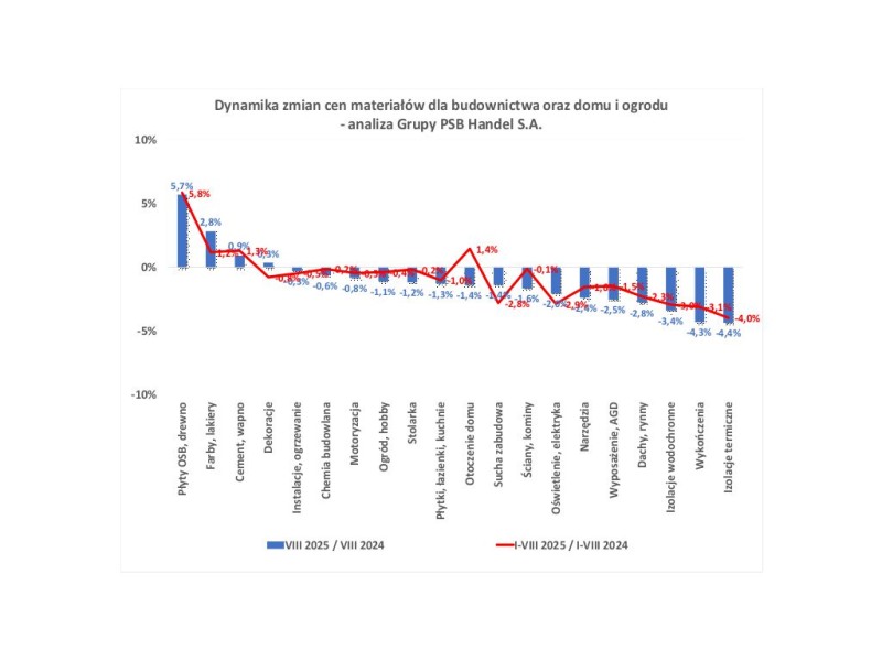 Zaś w okresie od I do VIII ceny wzrosły w 4 grupach, na czele z płytami OSB, drewnem (+6%), podczas gdy w większości kategorii notowano spadki. Najsilniej potaniały izolacje termiczne (-4%) oraz sucha zabudowa oświetlenia, elektryka, izolacji wodochronnych oraz wykończenia (-3%).