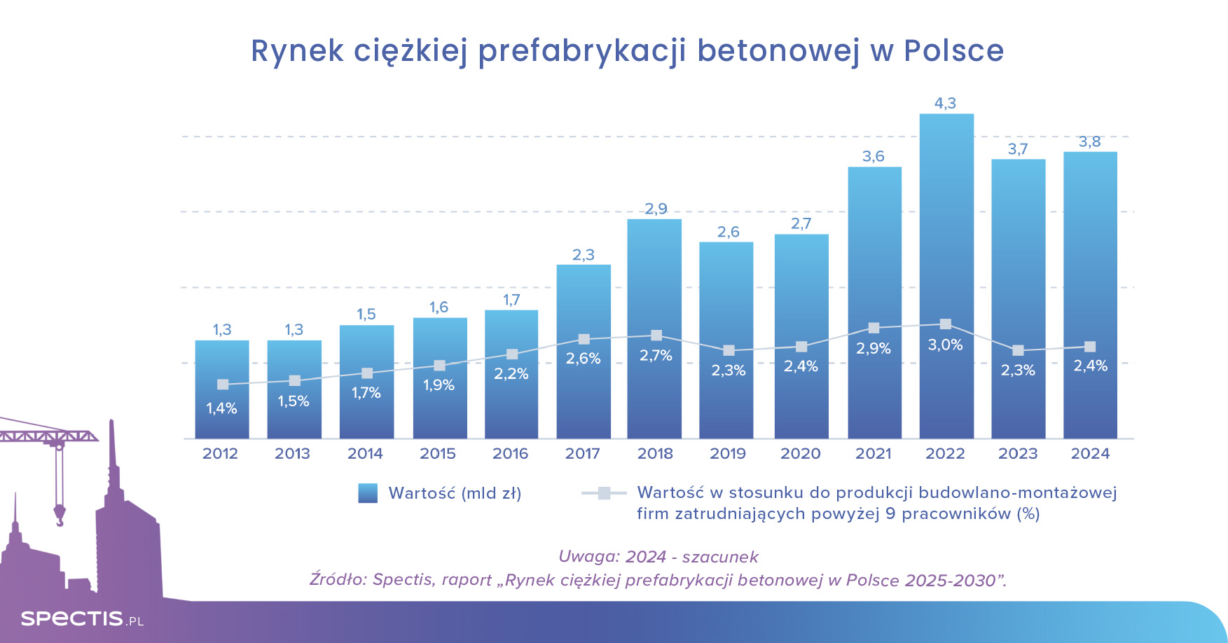 Jak wynika z raportu firmy badawczej Spectis zatytułowanego „Rynek ciężkiej prefabrykacji betonowej w Polsce 2025-2030”, całkowite przychody 50 największych producentów prefabrykatów w 2023 r. wyniosły 5,8 mld zł, z czego 63% przypadło na elementy prefabrykowane. Oznacza to, że wartość rynku ciężkiej prefabrykacji betonowej w 2023 r. wyniosła blisko 3,7 mld zł. Natomiast w 2024 r. wartość rynku wzrosła do 3,8 mld zł. W najbliższych latach wzrośnie udział rynkowy prefabrykatów na potrzeby budownictwa inżynieryjnego.