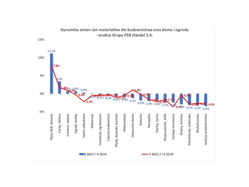 W zakresie cen (I-X), odnotowano wzrost w 4 grupach towarowych. Największe podwyżki dotyczyły kategorii płyty OSB, drewna (+8%). Dalej w kolejności uplasowały się grupy: farby, lakiery (+2%) oraz otoczenie domu i cement, wapno (po +1%). Nie zmieniła się ceny w grupach: stolarka, chemia budowlana i ogród, hobby. Jednocześnie ceny spadły w 13 grupach. Około 1% obniżki zanotowano w kategoriach: ściany, kominy, instalacje, ogrzewanie, motoryzacja, dekoracje oraz płytki, łazienki, kuchnie. O 2% spadły ceny w grupach: narzędzia, wyposażenie, AGD, sucha zabudowa i dachy, rynny. Większe spadki dotyczyły kategorii: wykończenia, oświetlenia, elektryka oraz izolacje wodochronne (po -3%). Najwyższą obniżkę odnotowano w kategorii: izolacje termiczne, gdzie ceny spadły o 4%.