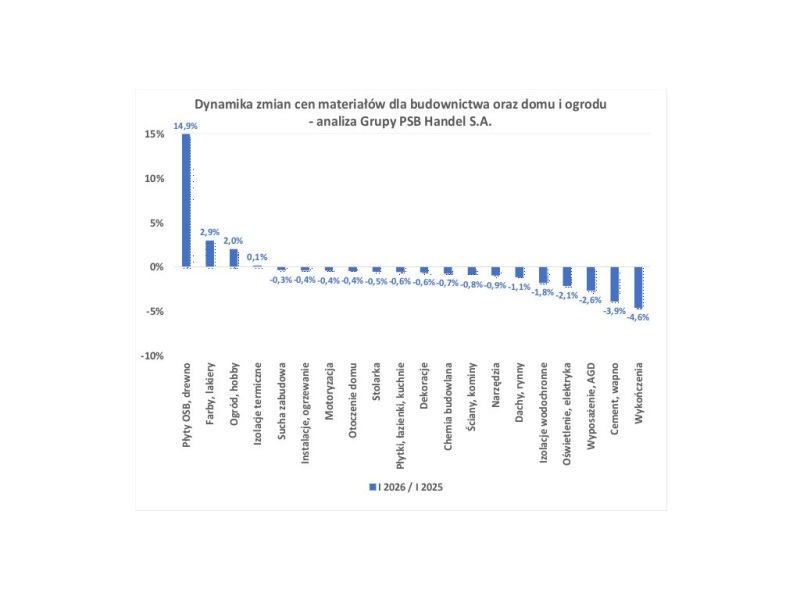 W styczniu 2026 r. wzrost cen odnotowano jedynie w 3 kategoriach, na czele z płytami OSB, drewnem (+15%), podczas gdy w większości pozostałych grup ceny nieznacznie spadły, z największą obniżką w kategorii wykończenia (-5%).