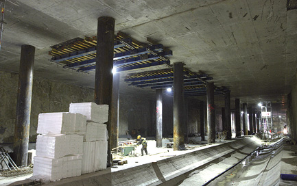 Kolejnym nietypowym elementem konstrukcyjnym, na który Harsco opracowało specjalną strategię szalowania, były tzw. „false tunel”. Są to elementy „uszczelniające” połączenia korpusu stacji z tunelem. Te tymczasowe konstrukcje o długości ok. 15 m, wysokości 7,0 m i szerokości 8,0 m są wykonywane z chudego betonu i rozbierane po przejściu tarczy drążącej. Do ich wykonania dostarczono kozły oporowe