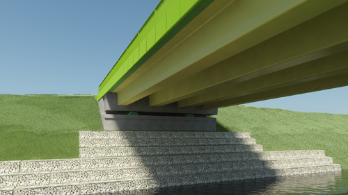 - Ustrój nośny przęsła: 4 dźwigary kompozytowe zespolone z płytą betonową z betonu lekkiego (LC35/38) zbrojoną prętami kompozytowymi